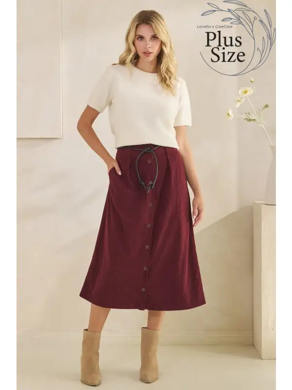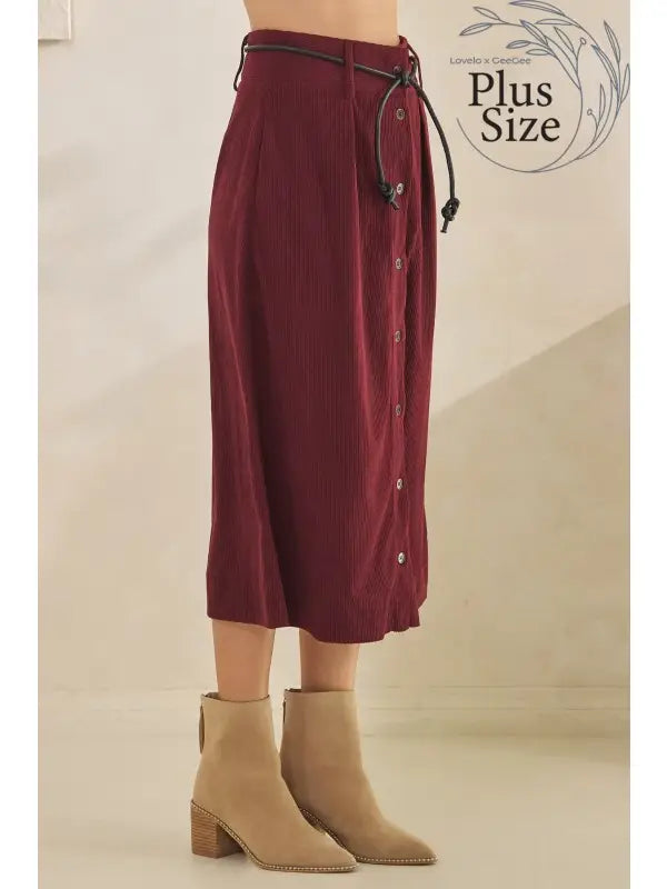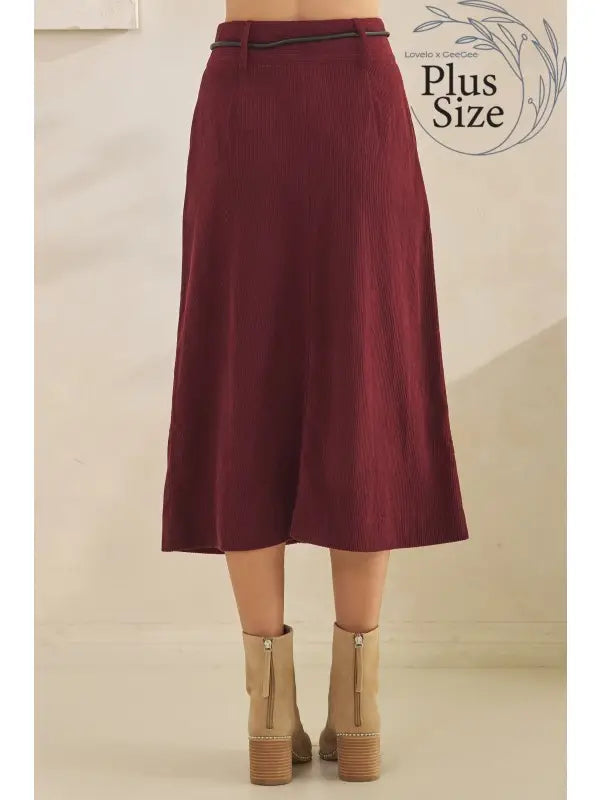 Plus-size corduroy midi skirt with side pockets and a faux leather tie belt.