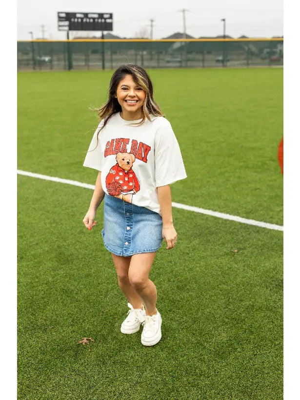 Show your team spirit with the Game Day Bear Shirt, featuring a bold red and white design that stands out in any crowd. Crafted for comfort and durability, this shirt is perfect for cheering on your favorite team while staying stylish. Its vibrant colors and quality fabric make it an essential addition to your game day wardrobe.